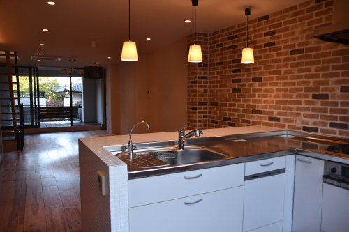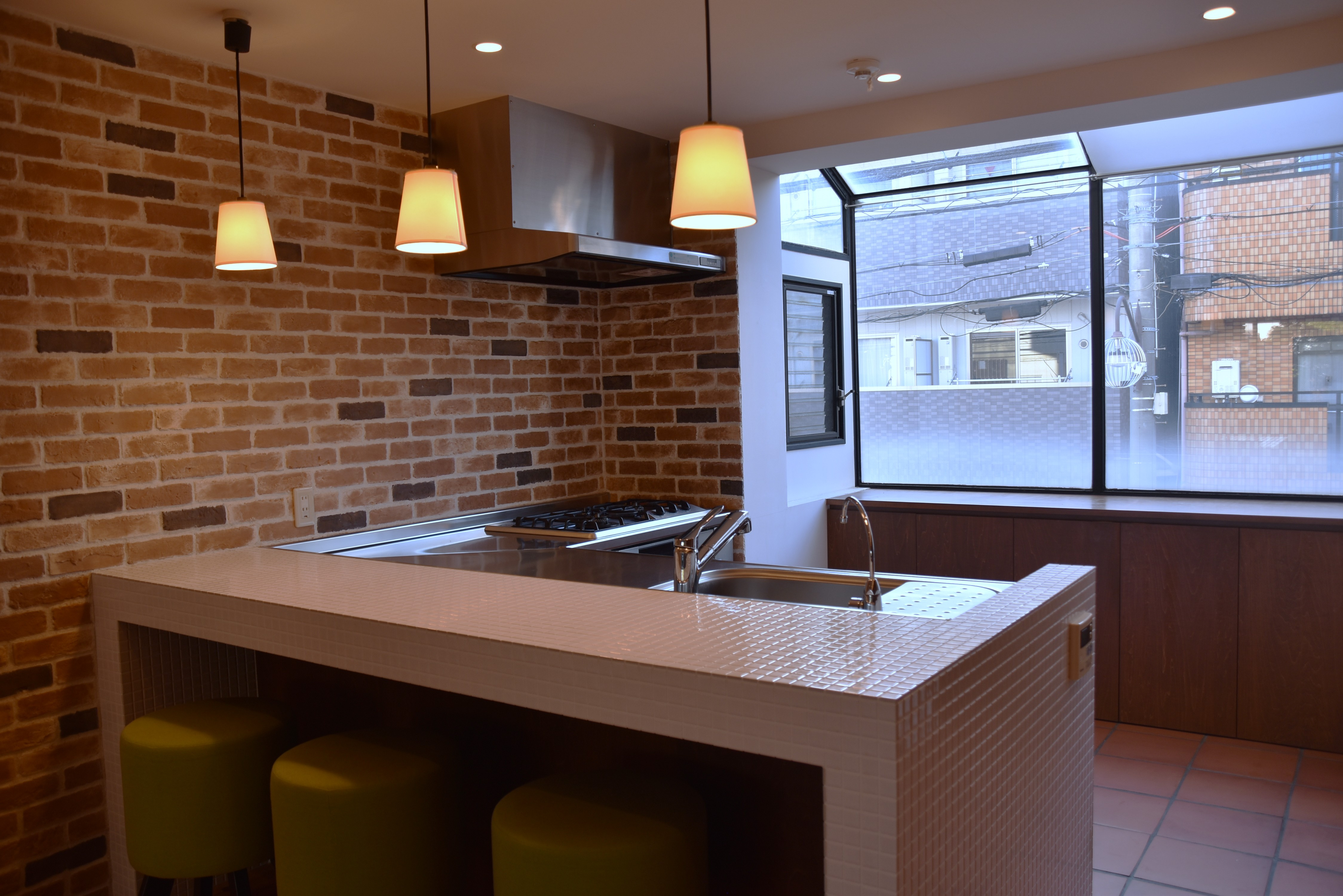 レンガ壁が温もりを添え、タイル張りのアイランドカウンターが空間のアクセントになっています。