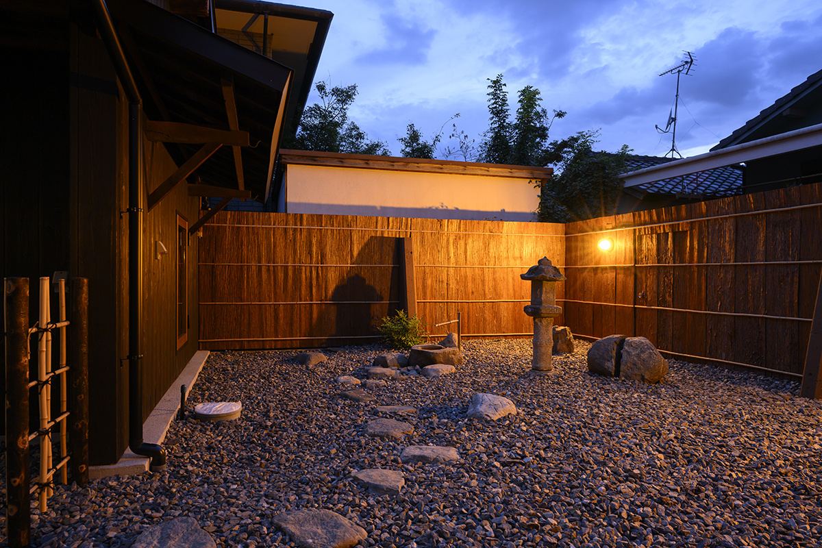 砂利を敷き詰めた庭に、飛び石、石灯籠。竹垣が空間を優しく区切り、落ち着いた和の雰囲気を演出しています。