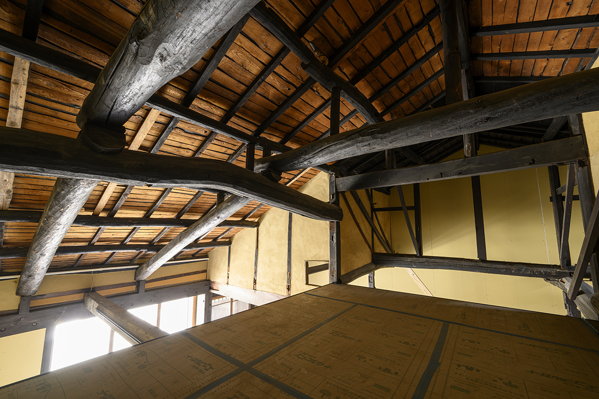 黒く太い梁が、何本も交差し、空間全体を支えています。